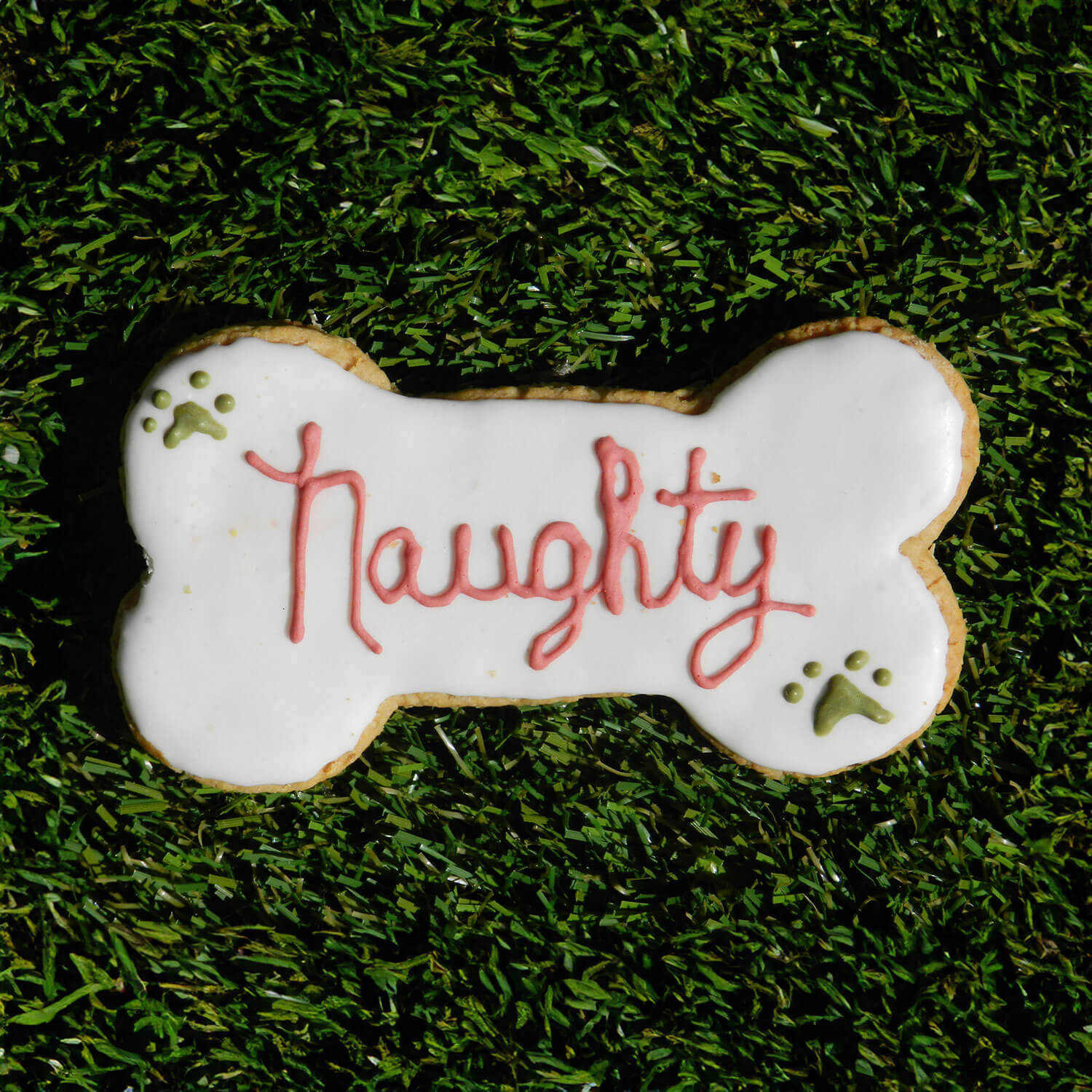 4″ X 2″ NAUGHTY  Bone Peanut Butter and Oat Cookie decorated with Tapioca flour icing. Approximately 2 ounces net weight