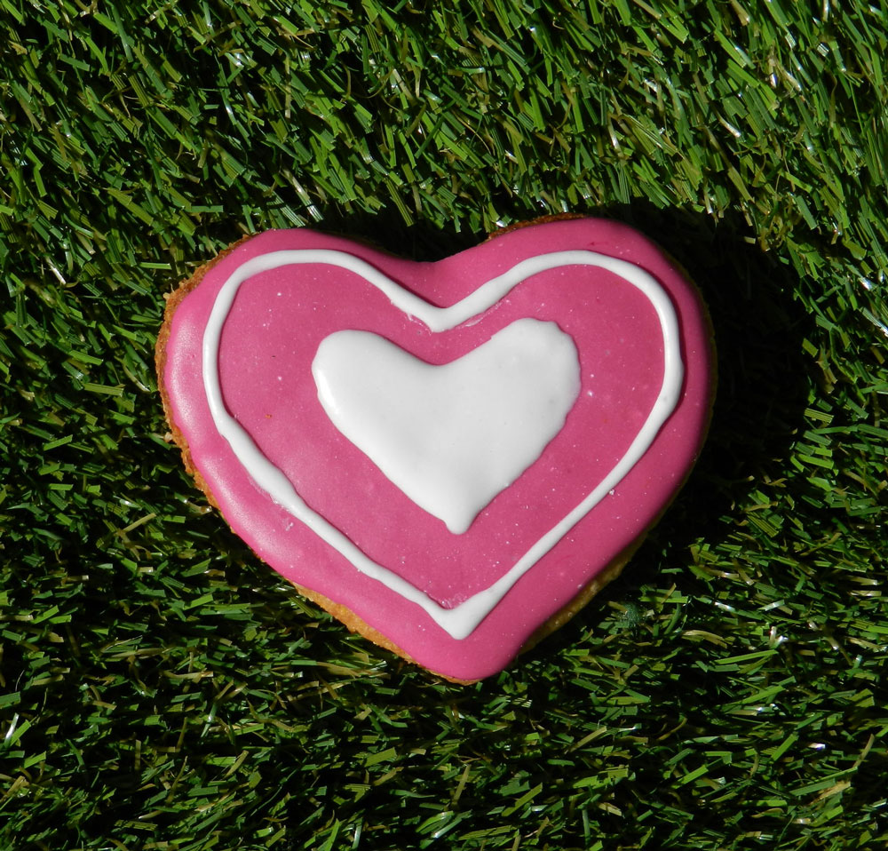 3″ X 3″ Large Heart Peanut Butter and Oat Cookie decorated with Tapioca flour icing. Approximately 2 ounces net weight